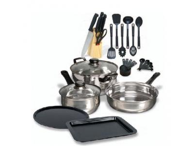 Gibson is a third generation company, initiated by our grandfather. Then our father Nejat Gabbay, established Gibson Overseas in the United States. Through his keen vision our foundation has been built on solid and genuine business principles. Gibson's goal is to be of service to you. We welcome you to explore the products we have to offer and look forward to being granted this opportunity by you. Gibson products are designed and developed in California with a commitment to style and value that's made us a necessary resource for retailers worldwide. Our time tested relationships and decades of expertise in Asia's manufacturing sector guarantees results no other company can provide.30-Piece set includes: 4-quart covered Dutch oven, 2-quart covered sauce pan, 8-3/4-inch fry pan, 1 chef's knife, 1 bread knife, 1 boning knife, 1 utility knife, 1 paring knife, 1 kitchen scissors, 1 wood block, 1-cup, measuring-cup: 1/2-cup, 1/3-cup, 1/4cup, 1/8-cupRead more Gibson Cuisine Select Fullerton 30-Piece Combo Set, Black